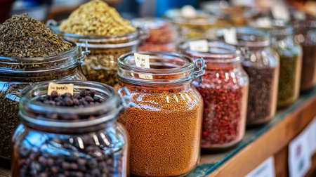 A bustling market stall featuring a colorful array of spices and herbs in glass jars, capturing the vibrant atmosphere of a traditional market. Ideal for themes related to cooking, food markets, and spices.
