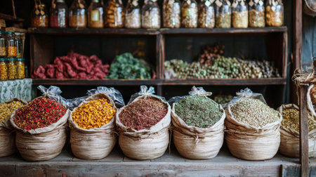 A variety of colorful dried herbs and spices displayed in burlap bags at a rustic market, with shelves of jars and natural goods in the background.