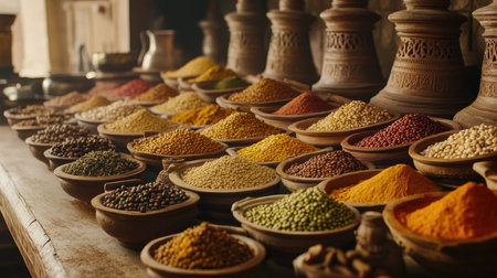 Vibrant array of aromatic spices in grinding mortar enhances culinary experiences