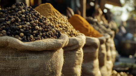 AI Generated. Vibrant Display of Various Spices and Legumes in Natural Fiber Sacks at a Local Market Showcasing Colorful Textures and Rich Agricultural Diversity