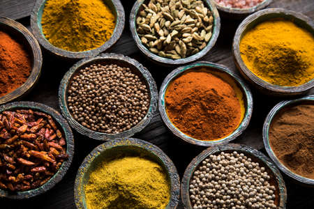 variation of spices on the vintage silver spoons, all spices on the table, colorful food background