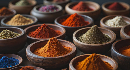 AI Generated. Assorted Spices in Wooden Bowls A Colorful Culinary Collection