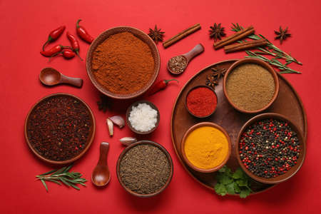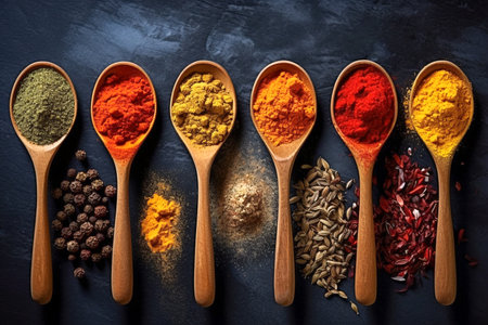 Spoons with various spices on a dark background. Colorful mix of spice. Top view. Selective focus