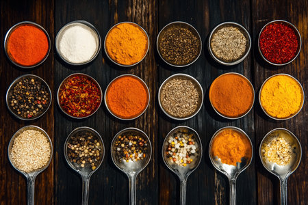 A vibrant assortment of spices and seeds in bowls and spoons, showcasing culinary diversity and creativity by Generative Ai