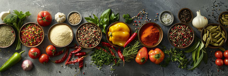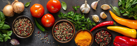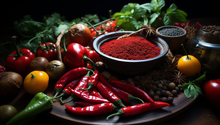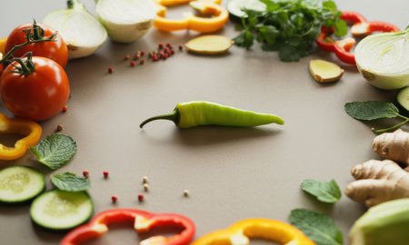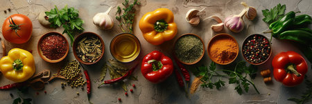vegetables, spices, and other ingredients arranged in a beautiful and artistic way, created with generative ai