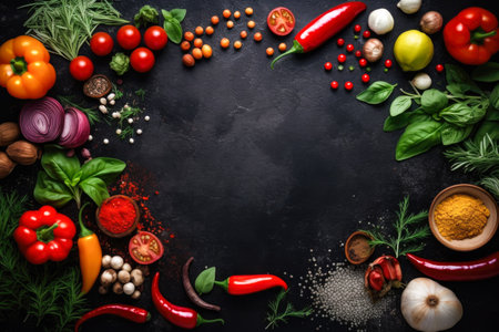 Food frame, ingredients for cooking. Food cooking background on black stone table. Fresh vegetables, herbs and spices. Top view with copy space, Generative AI