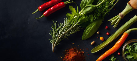 A vibrant arrangement of fresh vegetables and herbs on a dark background, perfect for food photography. Ideal for culinary inspiration and healthy eating ideas.