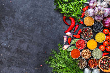 Assortment of spices, herbs and greens. Ingredients for cooking. Food background. Black stone table, Copy space for text. Top view.