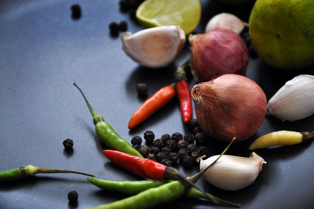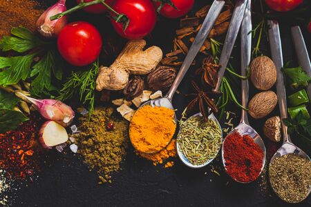 Close up of colorful spices and fresh vegetables for cooking on dark metal background with space for text. Top view. Bio Healthy food ingredients.