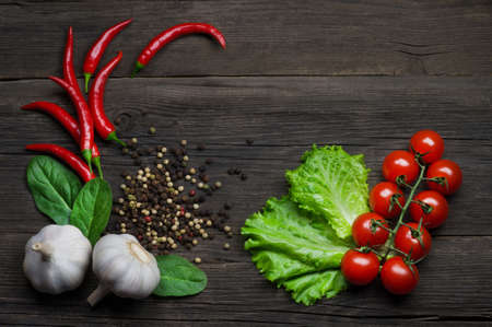 Ripe vegetables ingredients for cooking. Red hot chili peppers, cherry tomatoes, aromatic garlic, allspice peas and lettuce leaves on a wooden background. Culinary background.