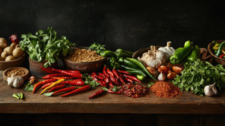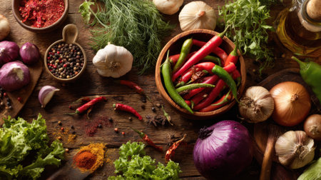 A rustic display of fresh vegetables and spices on a wooden table, showcasing bright colors and natural textures, ideal for culinary inspiration and healthy cooking.