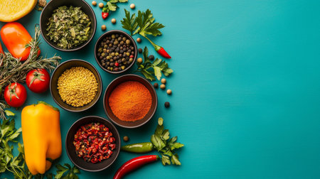 A colorful flat lay of fresh spices and vegetables including peppers, tomatoes, and various herbs displayed on a vibrant teal background.