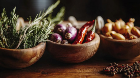 A rustic arrangement of wooden bowls filled with fresh rosemary, red onions, and chili peppers on a textured wooden table, creating a vibrant culinary scene.