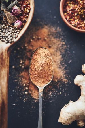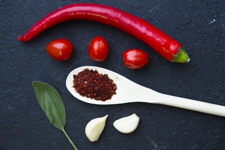 Dry spices in a wooden spoon ,red chili pepper, garlic and cherry tomatoes on a black stone background with copy space, top view