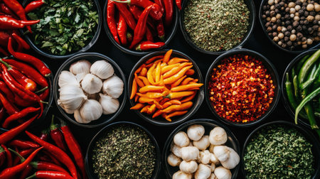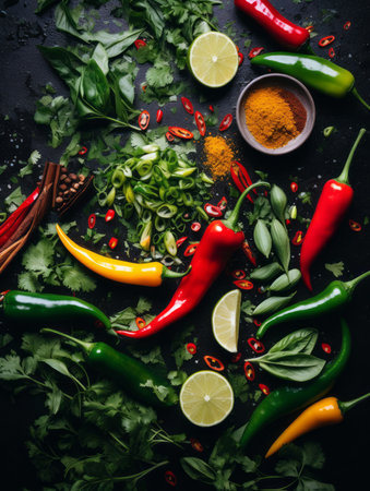 A vibrant display of fresh spices and vegetables showcases the rich textures and colors of natural ingredients perfect for any culinary creation.
