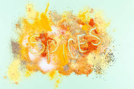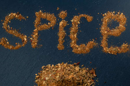 Spicy mixture on a dark stone background. The SPICE inscription is lined with spices