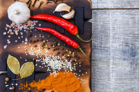 Composition with a cutting board, spices and hot pepper on a wooden background