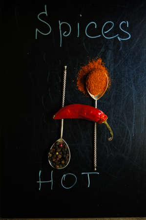 Top view of the inscription spices made from red capsicum ground pepper and cinnamon on the table. Spicy food concept and oriental cuisine