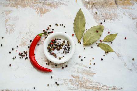 Various spices, peppers and herbs close-up top view. A set of peppers and spices for cooking. Isolated on white background