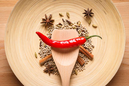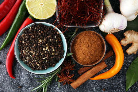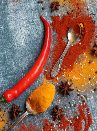 Colorful still life with different types of aroma spices. Vibrant colors of paprika, turmeric, chili pepper and anise star. Beautiful composition of spices.