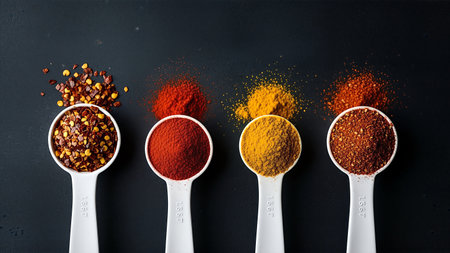 Overhead shot of four white measuring spoons filled with different spices, arranged on a black surface. The spices include red pepper flakes, paprika, turmeric, and chili powder. The composition is clean, with high contrast and a focus on color and texture.