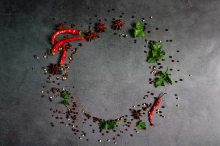 gastronomy, cookery. culinary. Secrets of delicious food. Conditions and spices. Dry allspice red and white pepper, fresh parsley, star anise, chili pepper on a black background, top view, copy space