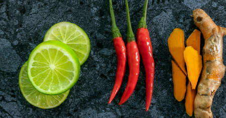 Ingredients for Spicy Soup ,Thai food place on stone background.