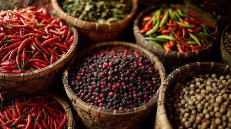 A stunning collection of fresh spices and chilies displayed in traditional baskets, showcasing vibrant colors and textures in a lively market environment.