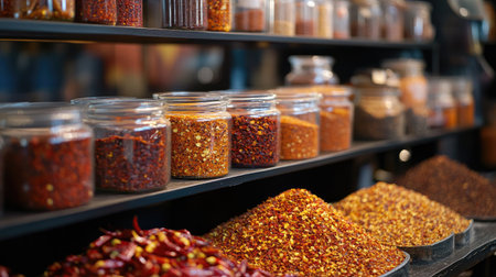 A vibrant display of colorful spices in jars on shelves, showcasing a rich variety of textures and flavors ideal for culinary enthusiasts and chefs alike.