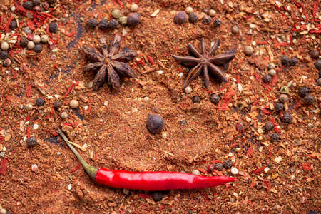Close-up of cheerful face made from spices of red capsicum cinnamon and ground pepper on the table. Spicy food concept and oriental cuisine