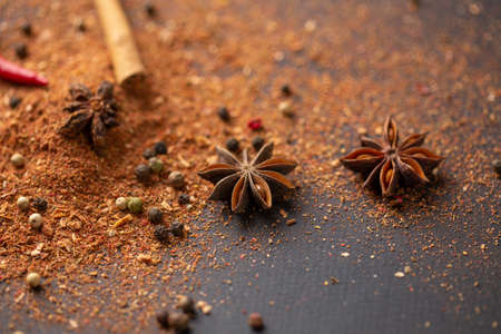 Close-up of star anise and cinnamon and ground pepper lie on the table. Spicy food concept and oriental cuisine