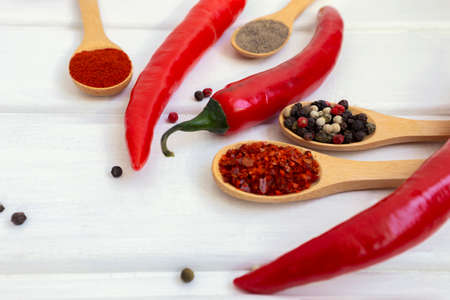 Wooden spoons with paprika, turmeric, herbs and pepper