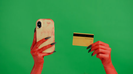 Creepy halloween devil monster hand in red paint with black nails taps card number in smartphone app, isolated on chroma key green screen, workspace mockup.