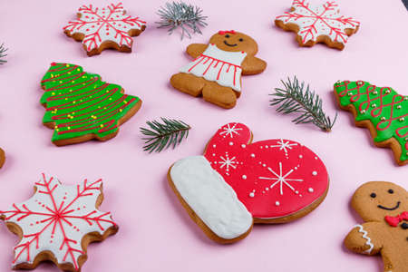 Gingerbread cookies with multicolored frosting decorated for Christmas and New Year holidays