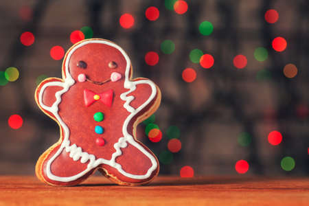 Home made baked Christmas gingerbread cookie tree as a gift for family and friends on wooden background. With colorful lights from Christmas tree on background. With icing sugar as snow.