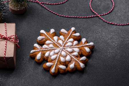 Christmas gingerbreads painted with sugar icing. Holiday cookies on cookies. Cookies in the shape of a snowflake, gift, candy, sock