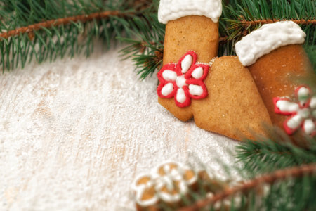 Composition of fresh cookies and fir branch on white wooden table. Close up.