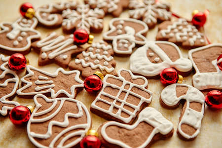 Christmas cookies compostion on table. With small balls. Various shapes on gingerbread biscuits. View from above.
