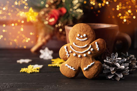 gingerbread man near Christmas tree with toys by garland, the concept of Christmas