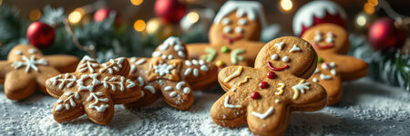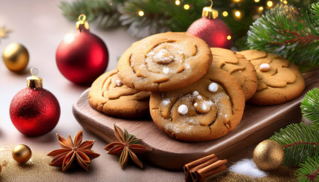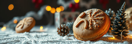 Close-up of delicious Christmas cookies, decorated with festive ornaments and a Christmas tree in the background. A delightful holiday scene.