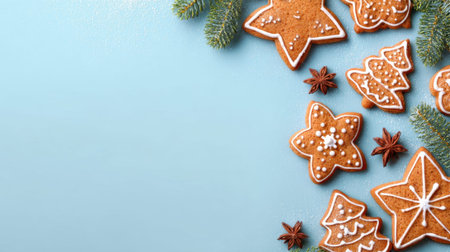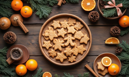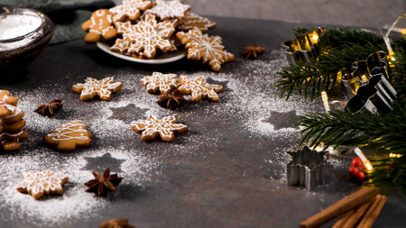 Christmas gingerbread cookies and spices on wooden background. Assortment of festive food.