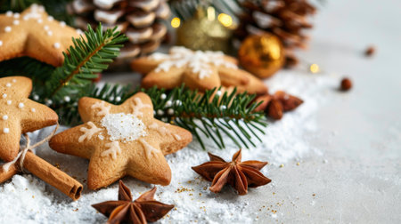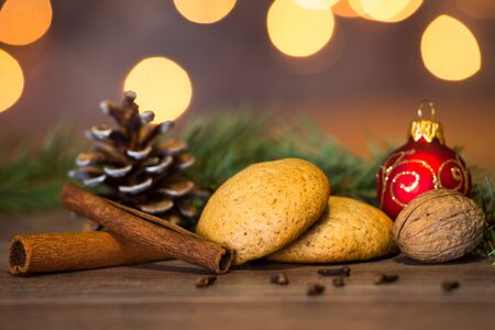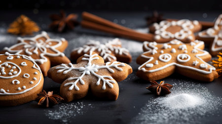 Christmas gingerbread cookies and spices on wooden background. Close-up