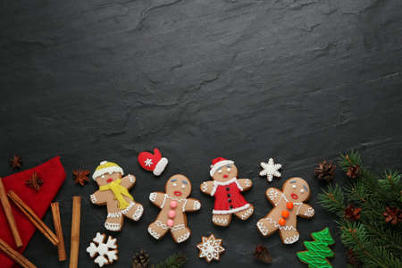 Flat lay composition with delicious Christmas cookies on black table, space for text