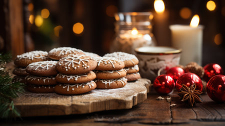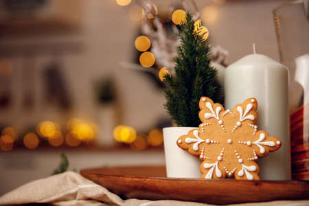 gingerbread cookie on a wooden plate. For recipes. Festive table setting. Home comfort and warm atmosphere. New Year and Christmas. Baking for dessert. Candles and garland