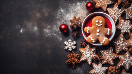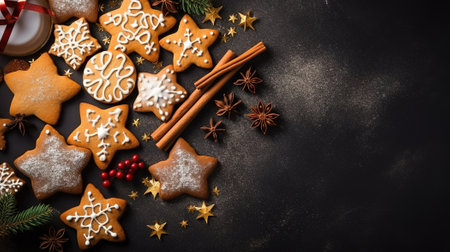 Pattern of gingerbread cookies in different shapes on a dark surface. Top view.