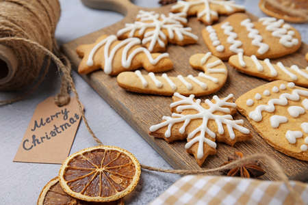 Fresh and tasty Christmas gingerbread cookies placed on white rusty table. Different shapes. Santa claus, snowflake, tree, gift, snowman.