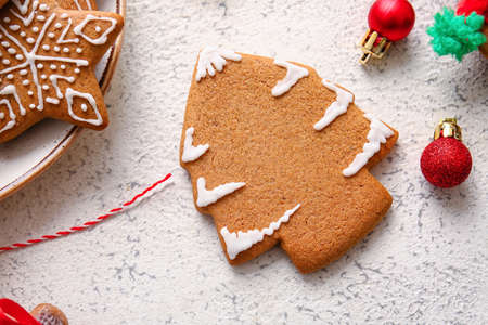 Tasty gingerbread cookie in shape of Christmas tree on light background