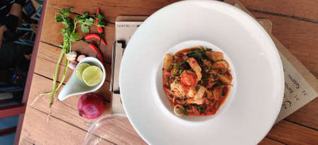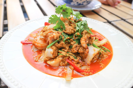 stir-fried seafood in curry powder, stir fried squid in yellow curry or Stir-fried squid and Stir-fried shrimp with curry