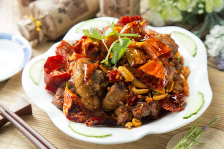 Spicy Saliva chicken with red chilli, chopsticks and fork served in pot isolated on background side view of taiwanese food