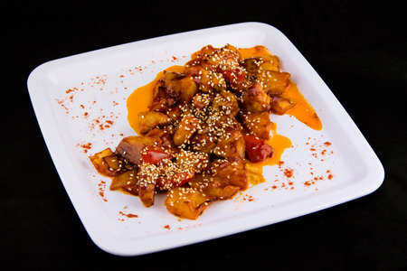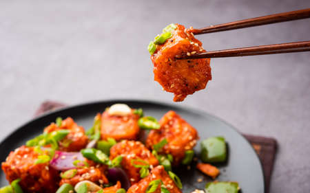 Kkanpunggi or Korean Spicy Garlic Fried Chicken on black plate on dark slate table top. Kan Pung Gi is korean and chinese cuisine dish. Typical asian food and meal.